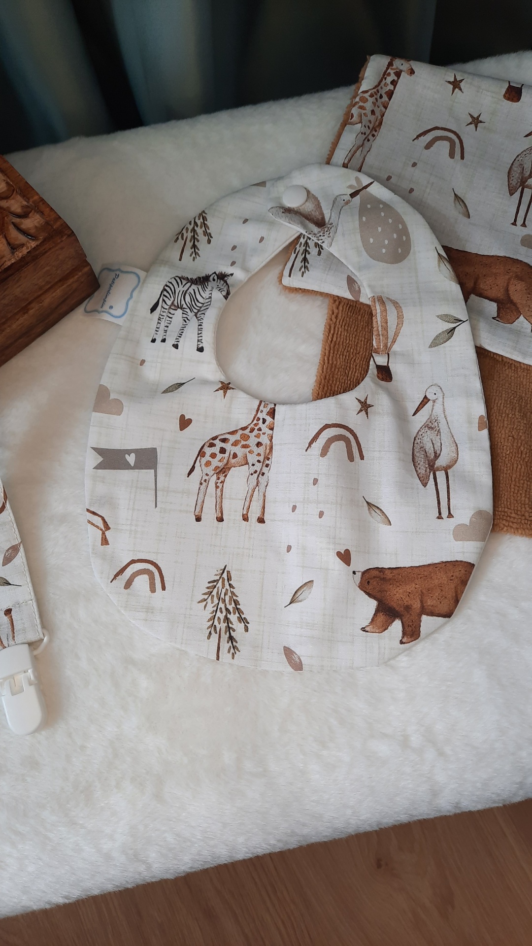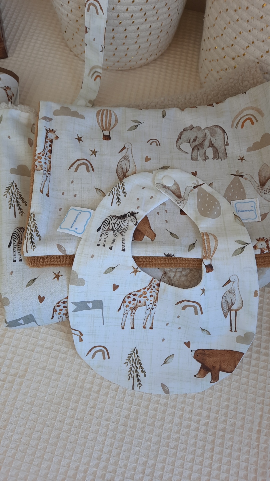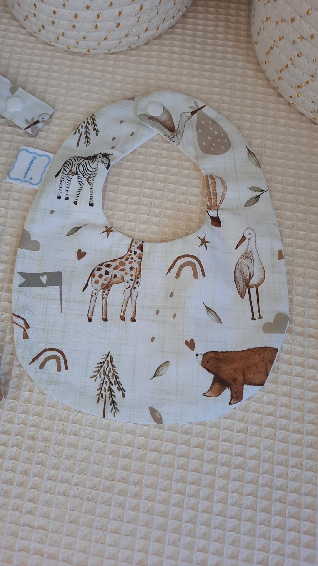 Babete em tecido 100% algodão e forro em tecido jersey plastificado.
