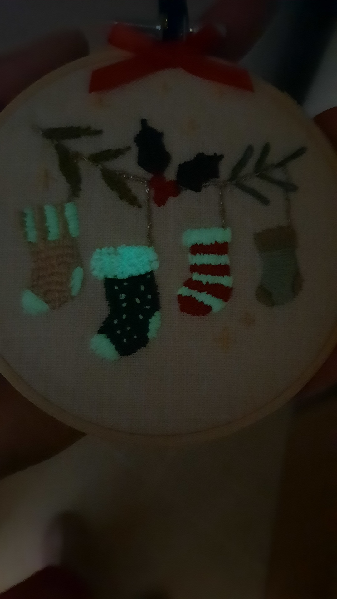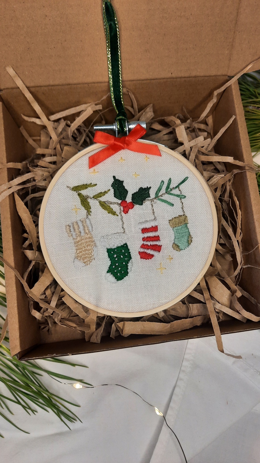 Botas de Natal bordadas a vários pontos sobre linho em bastidor 10 cm.