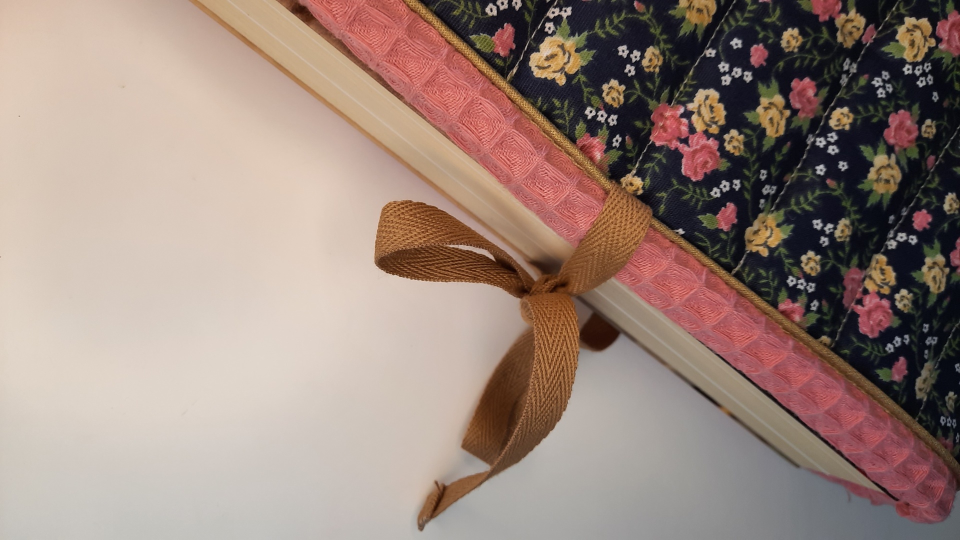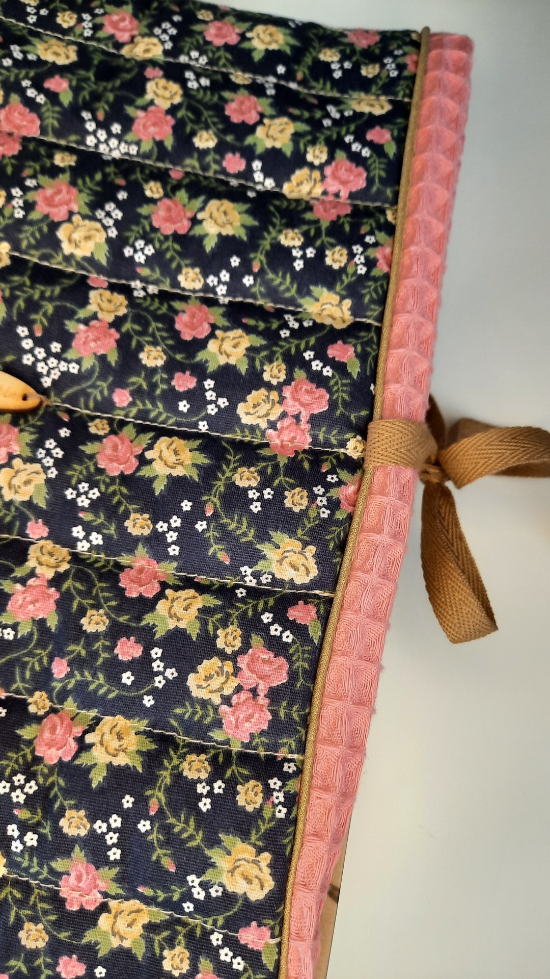 É reversível, podendo ser usada dos dois lados. De um lado, tecido estampado floral em fundo azul escuro e, do outro lado, tecido efeito waffle cor rosa.