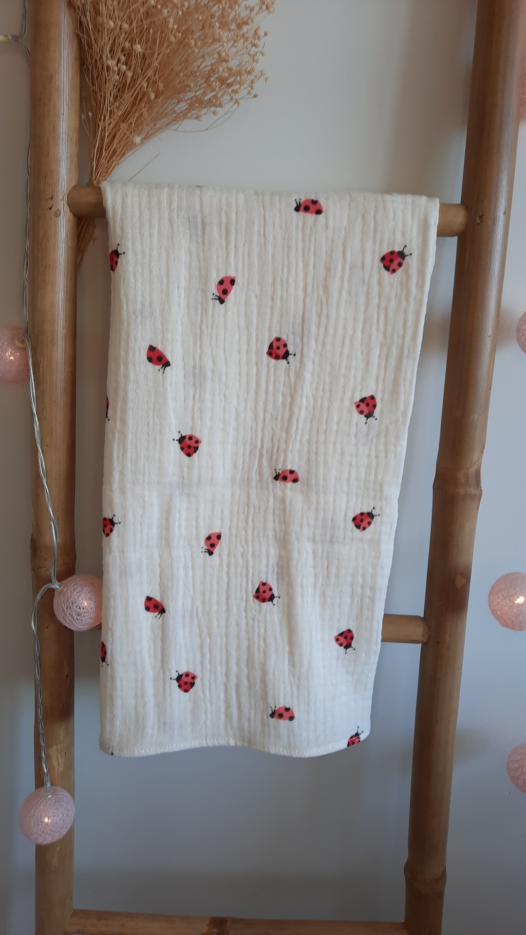 Fralda dupla em tecido de musselina fundo cor crú e umas joaninhas muito fofas.