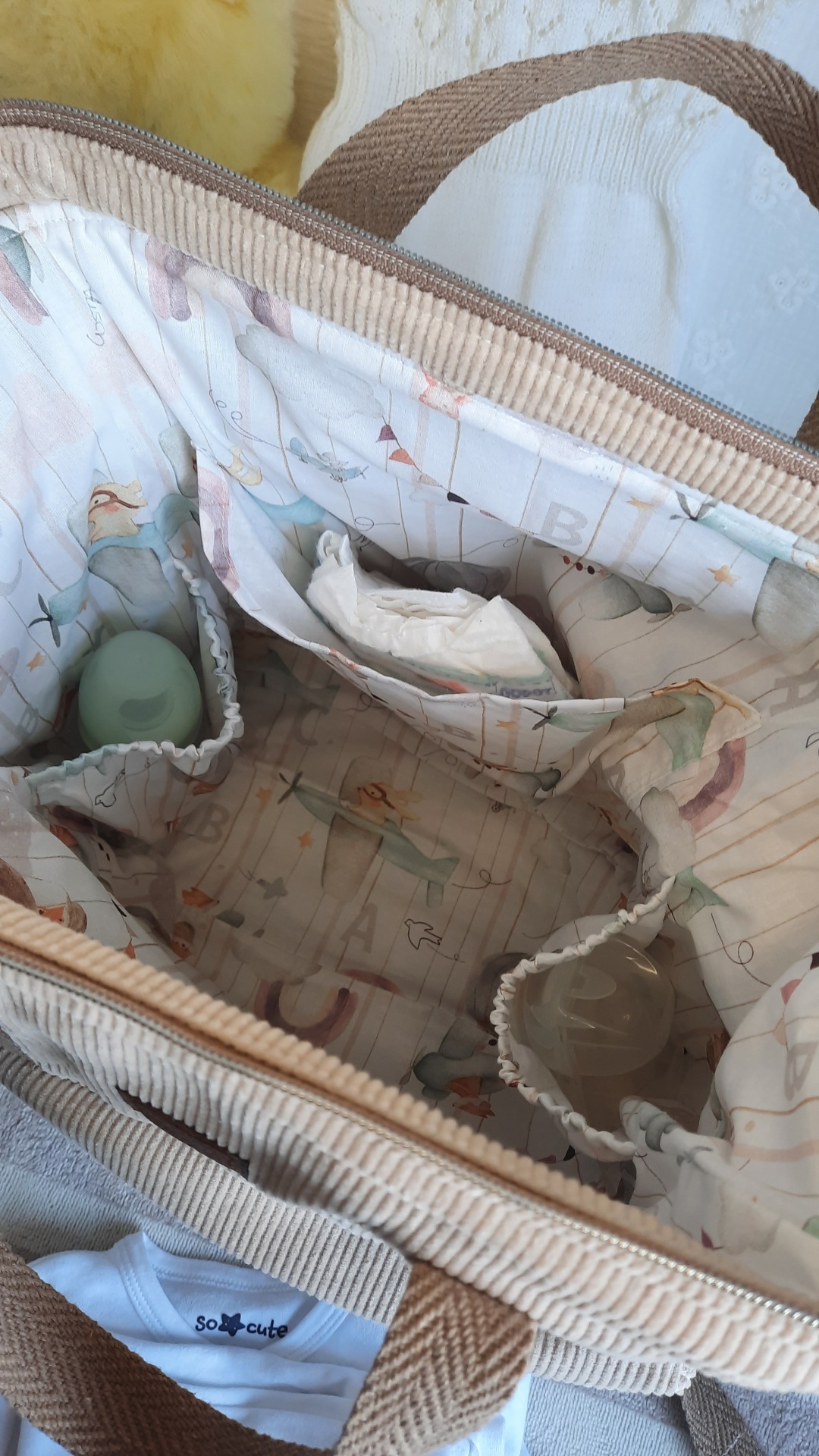 Tecido exterior em bombazina bege e tecido interior estampado de algodão com padrão de letras e aviões em cores pastel.