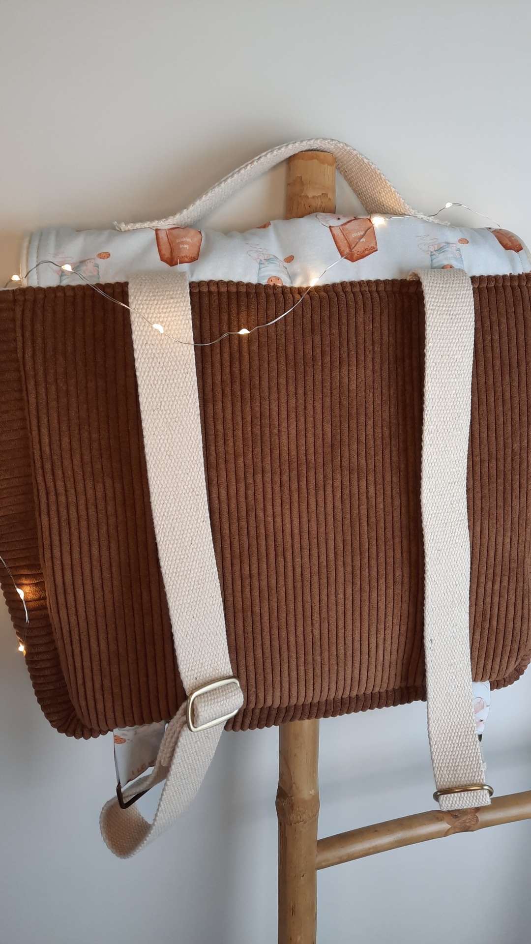 Em bombazina e tecido de algodão estampado. Tem 2 bolsos, um exterior e outro interior e alças reguláveis.