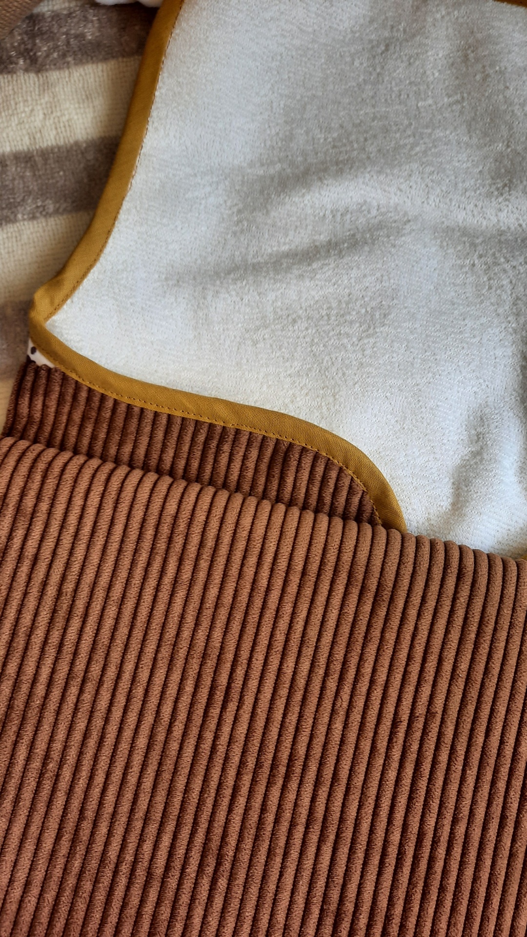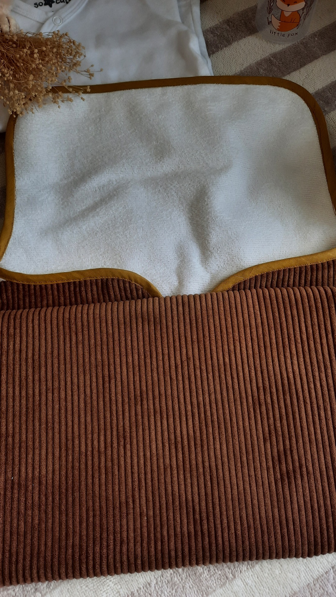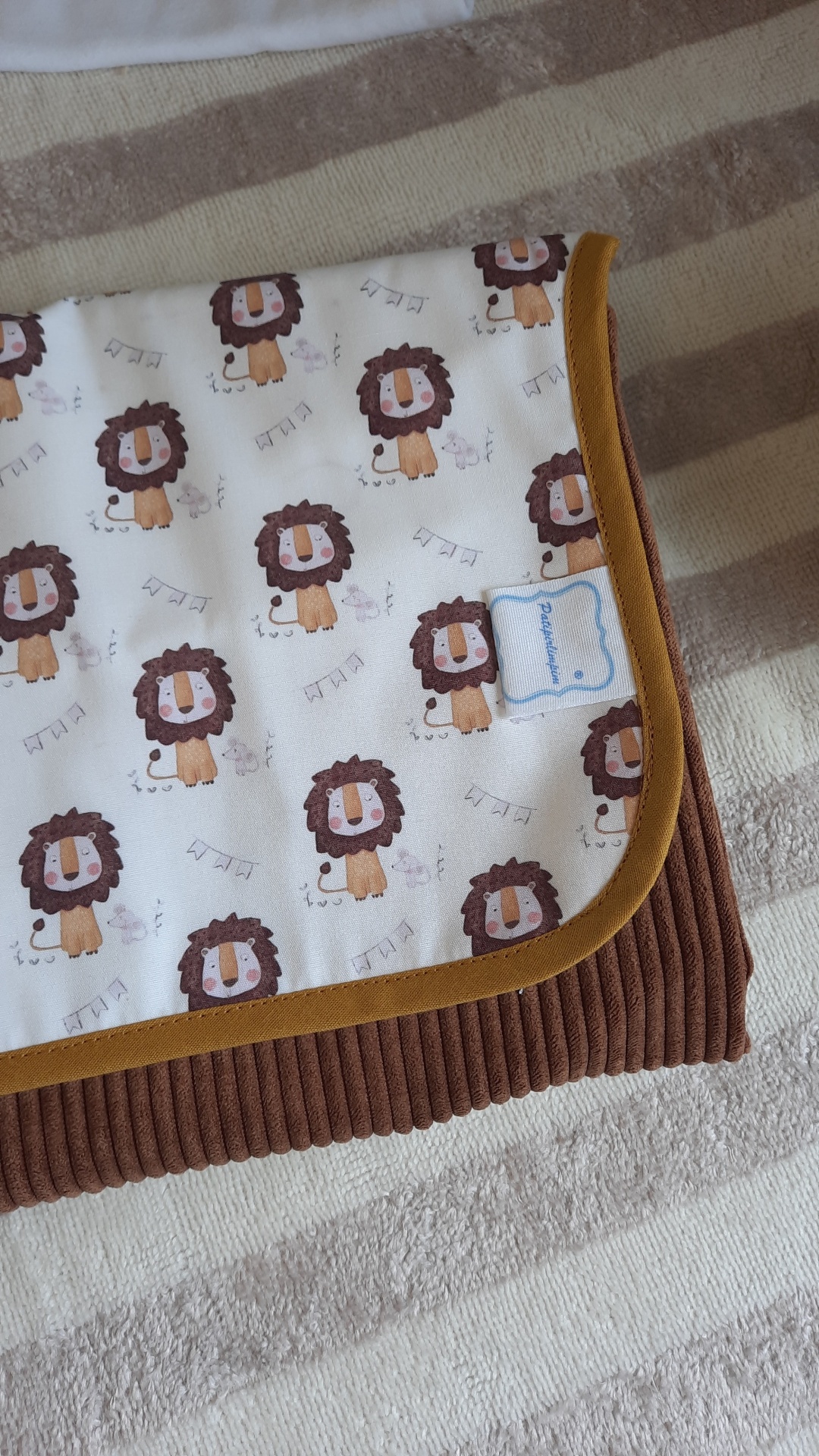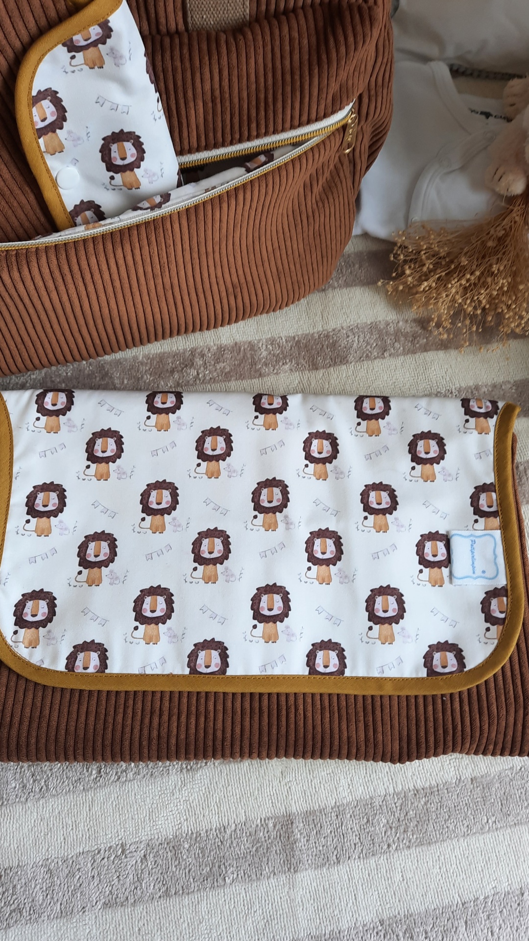 Muda fraldas portátil em bombazina castanha e tecido de algodão com padrão de leões.
