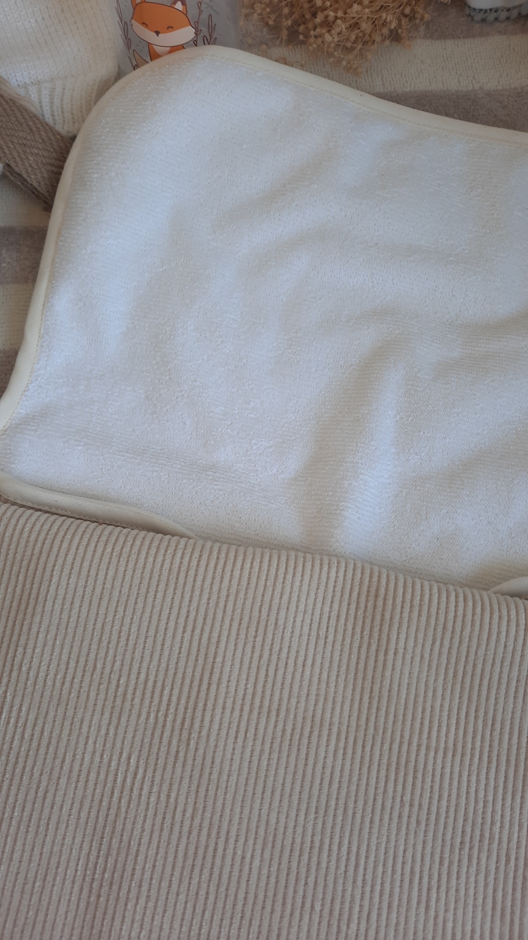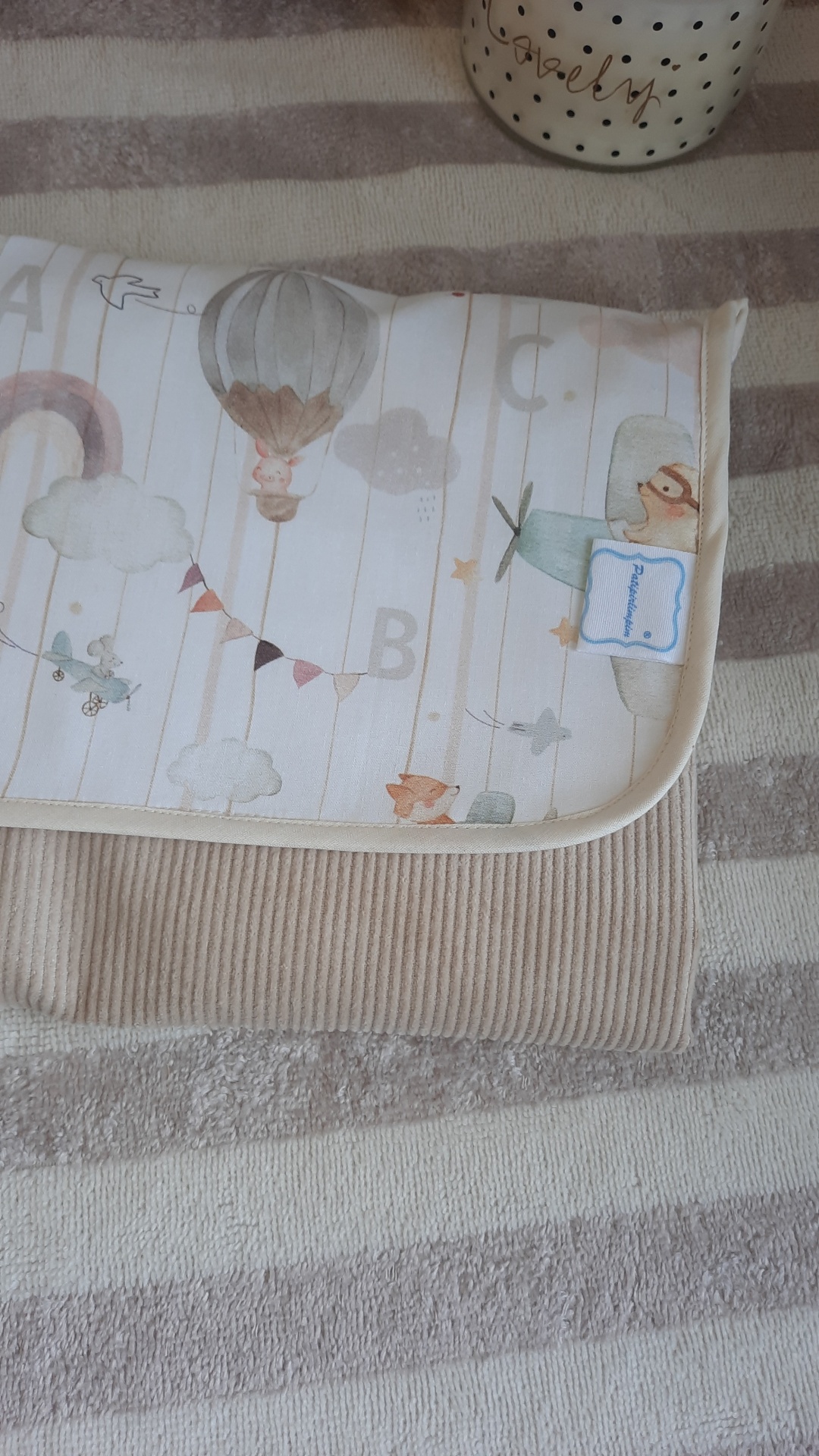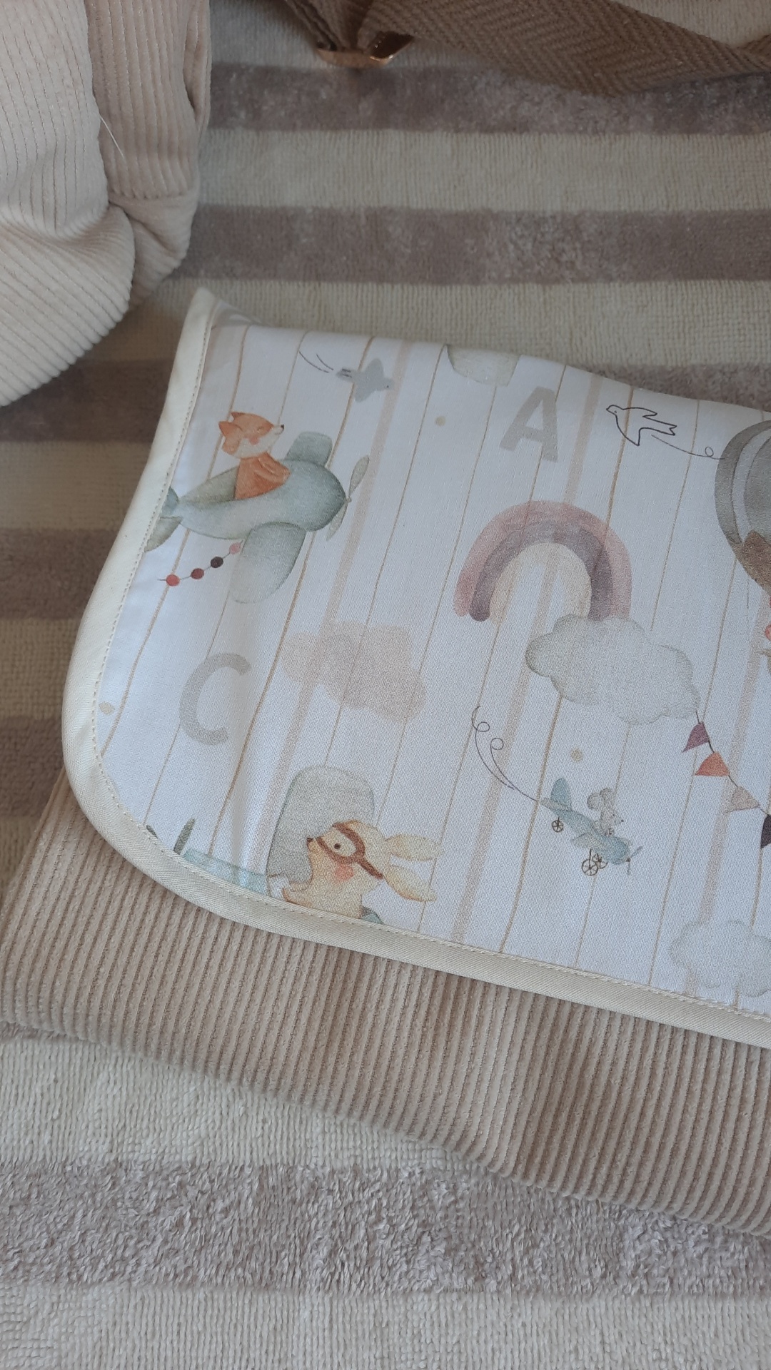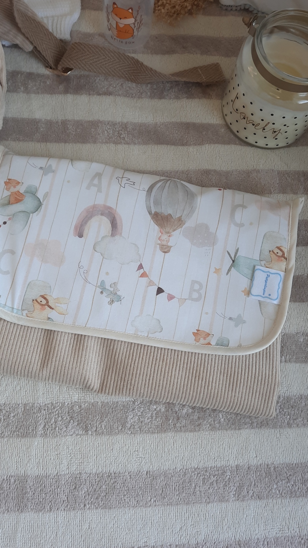 Muda fraldas portátil em bombazina bege e tecido de algodão com estampado bem divertido em tons pastel.
