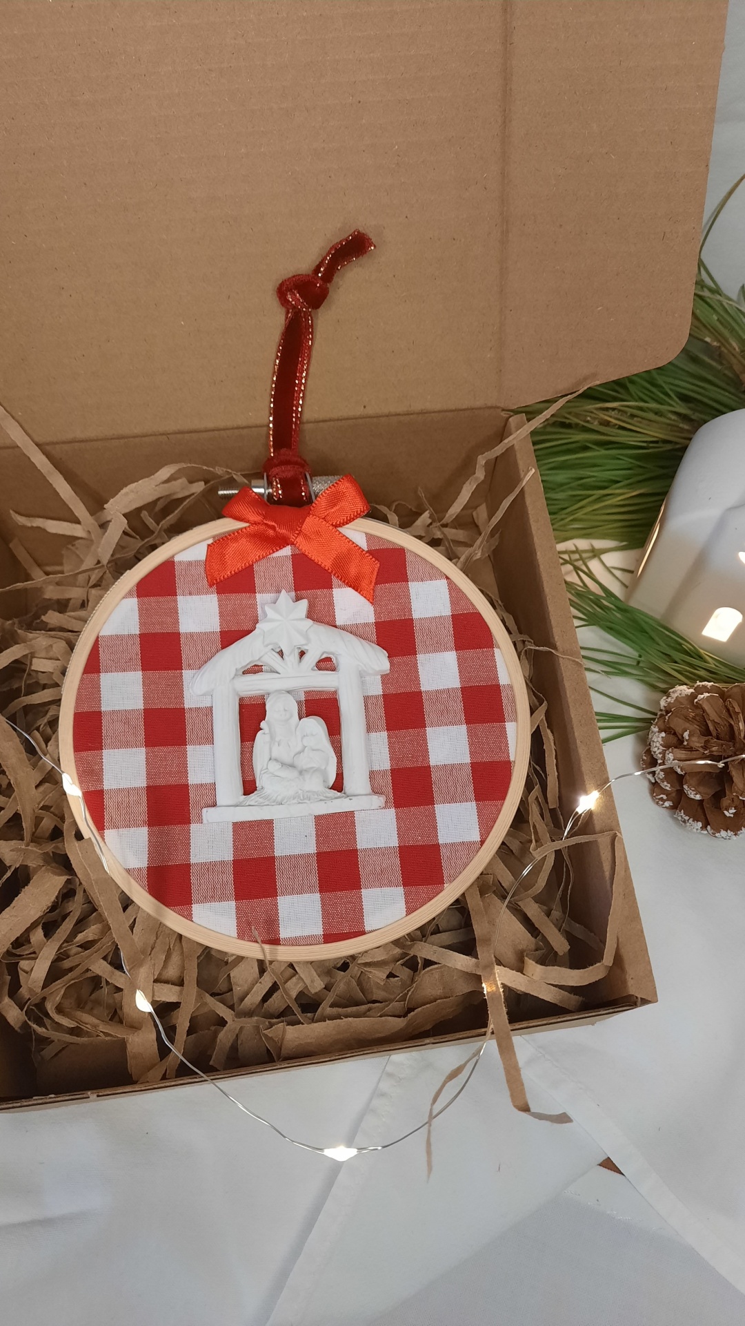 Presépio marfinite aplicado em tecido padrão xadrez vermelho e branco em bastidor 10 cm.
