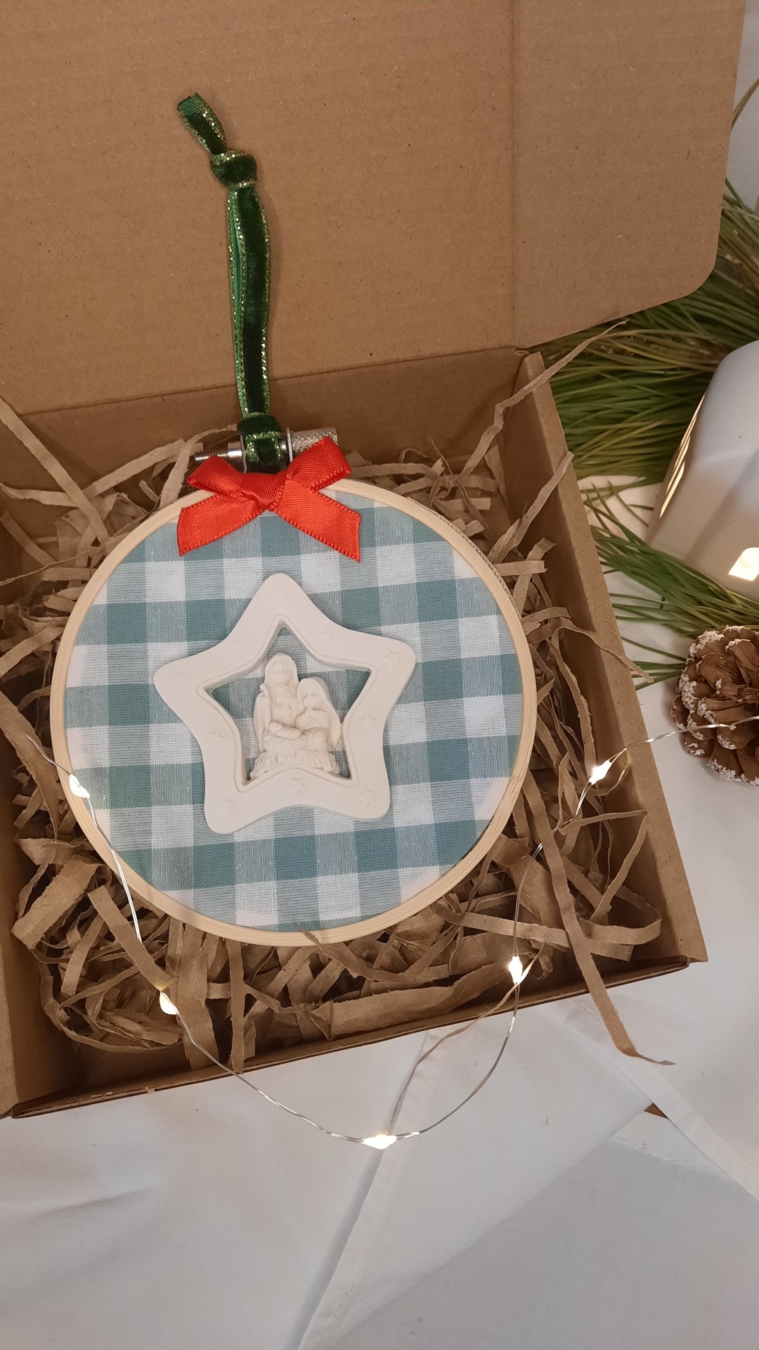 Presépio marfinite aplicado em tecido padrão xadrez verde e branco em bastidor 10 cm.