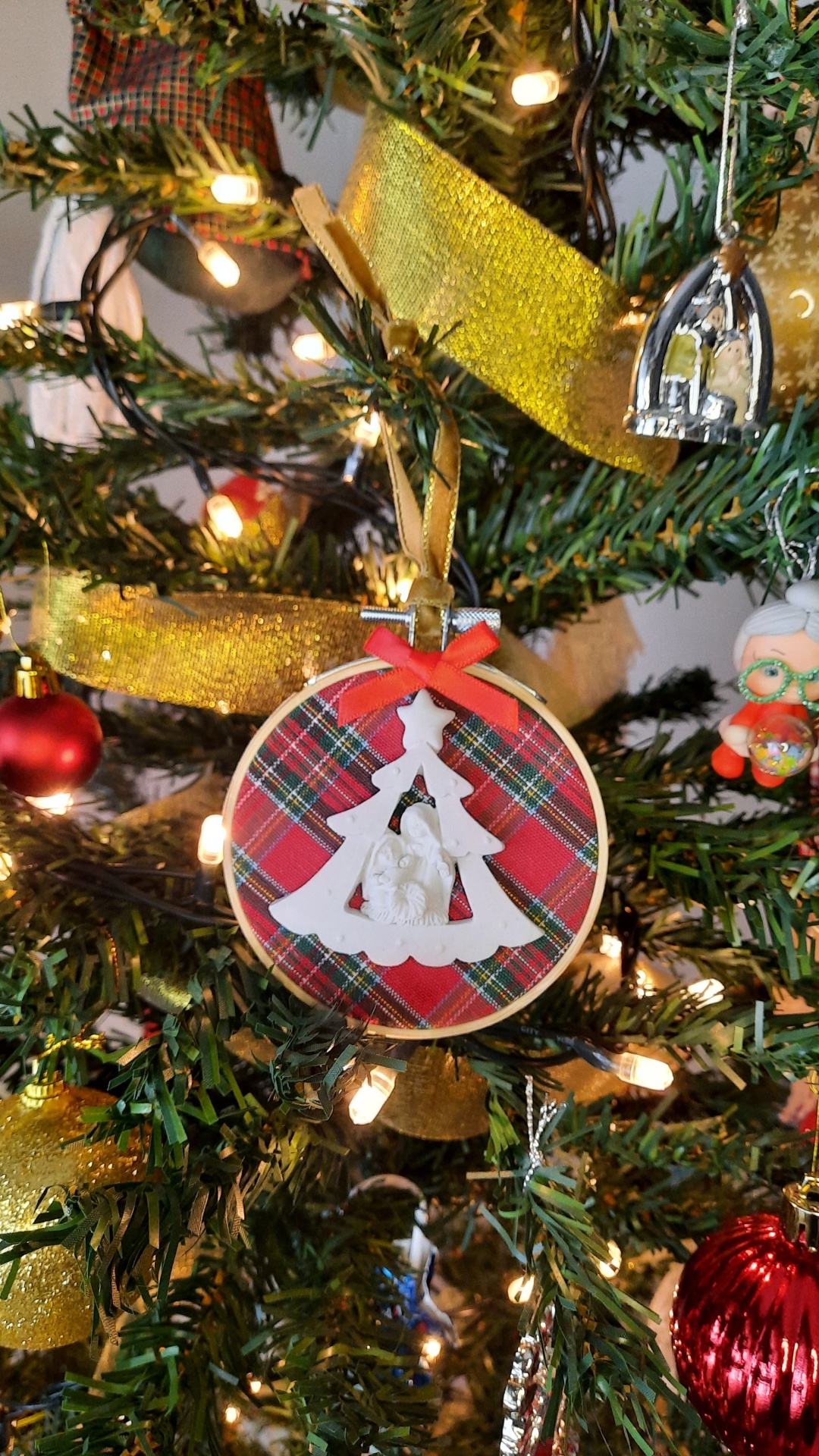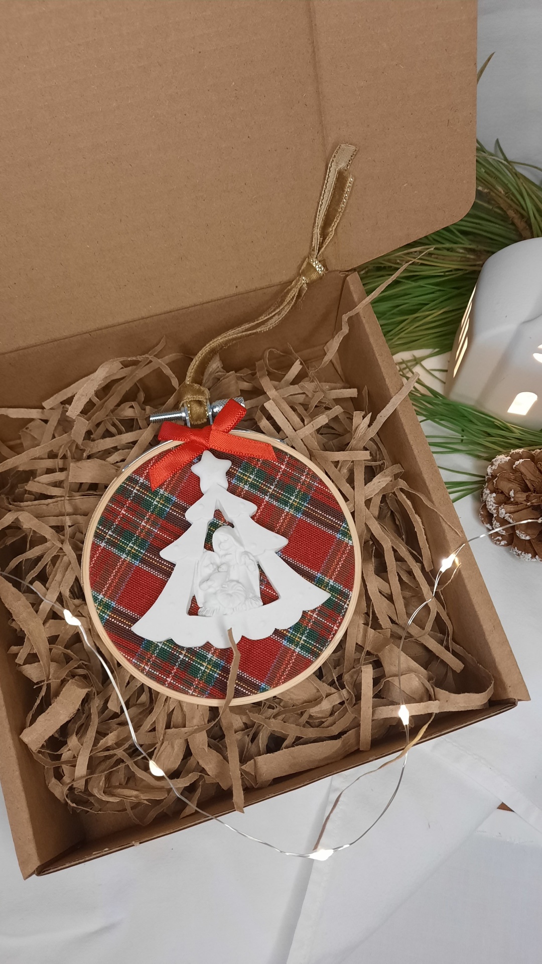 Presépio marfinite aplicado em tecido padrão tartan em bastidor 8cm.