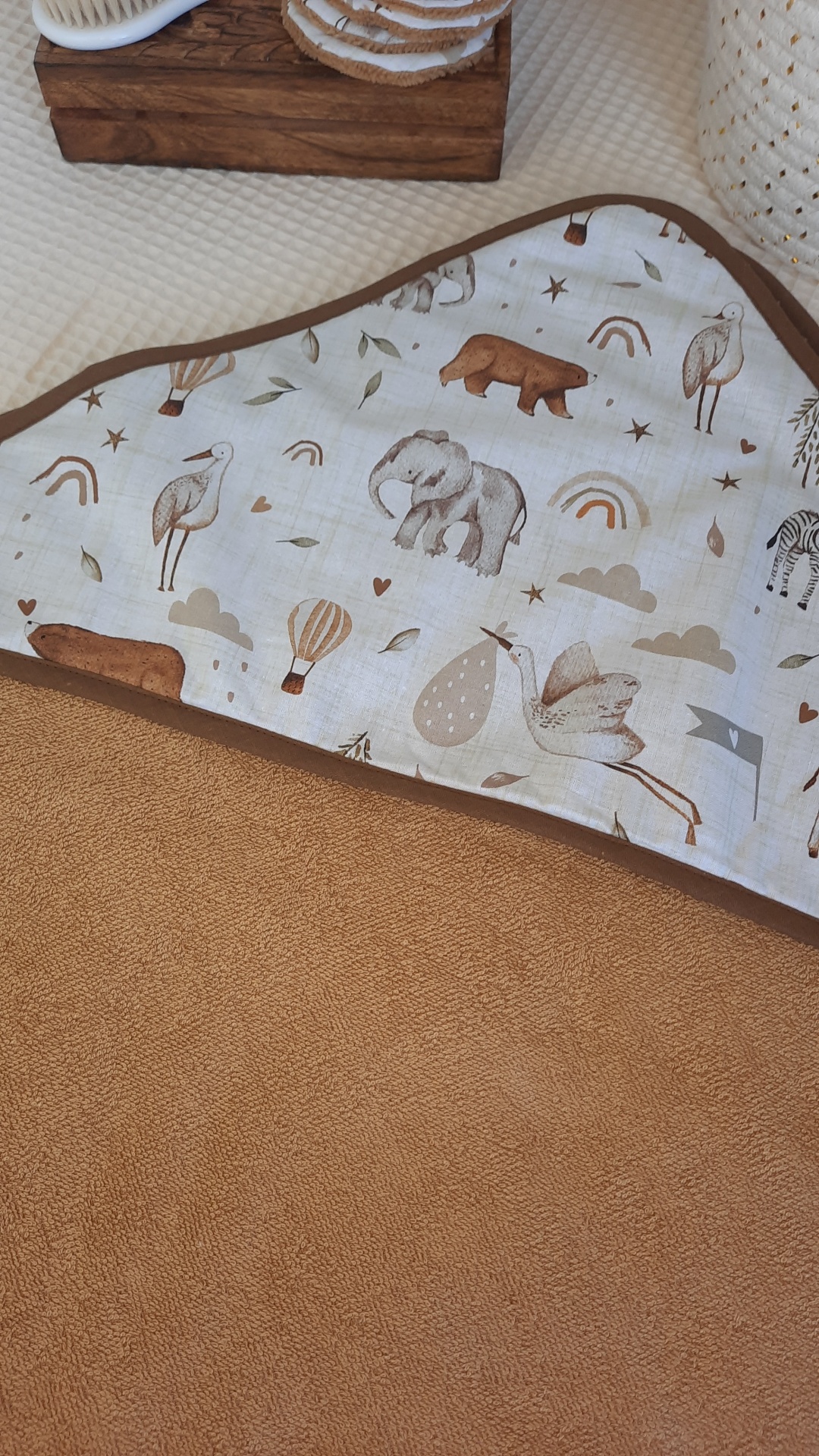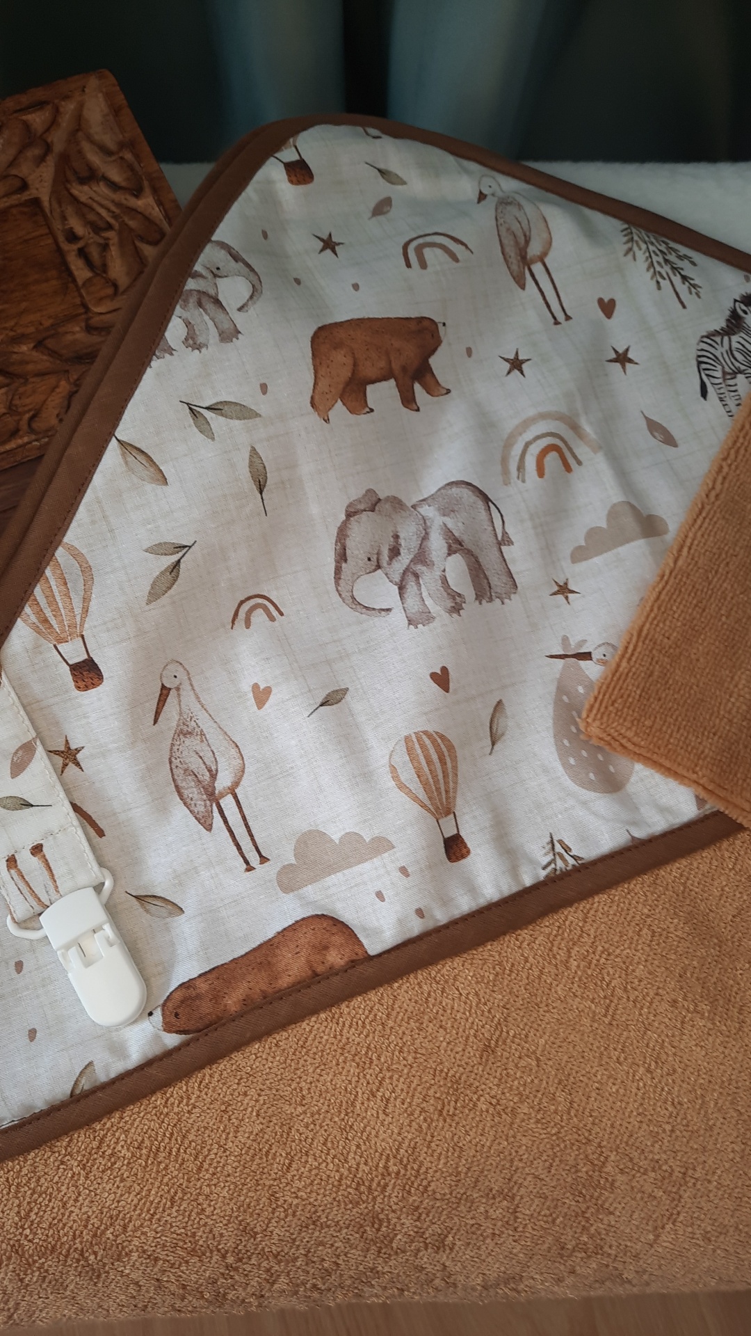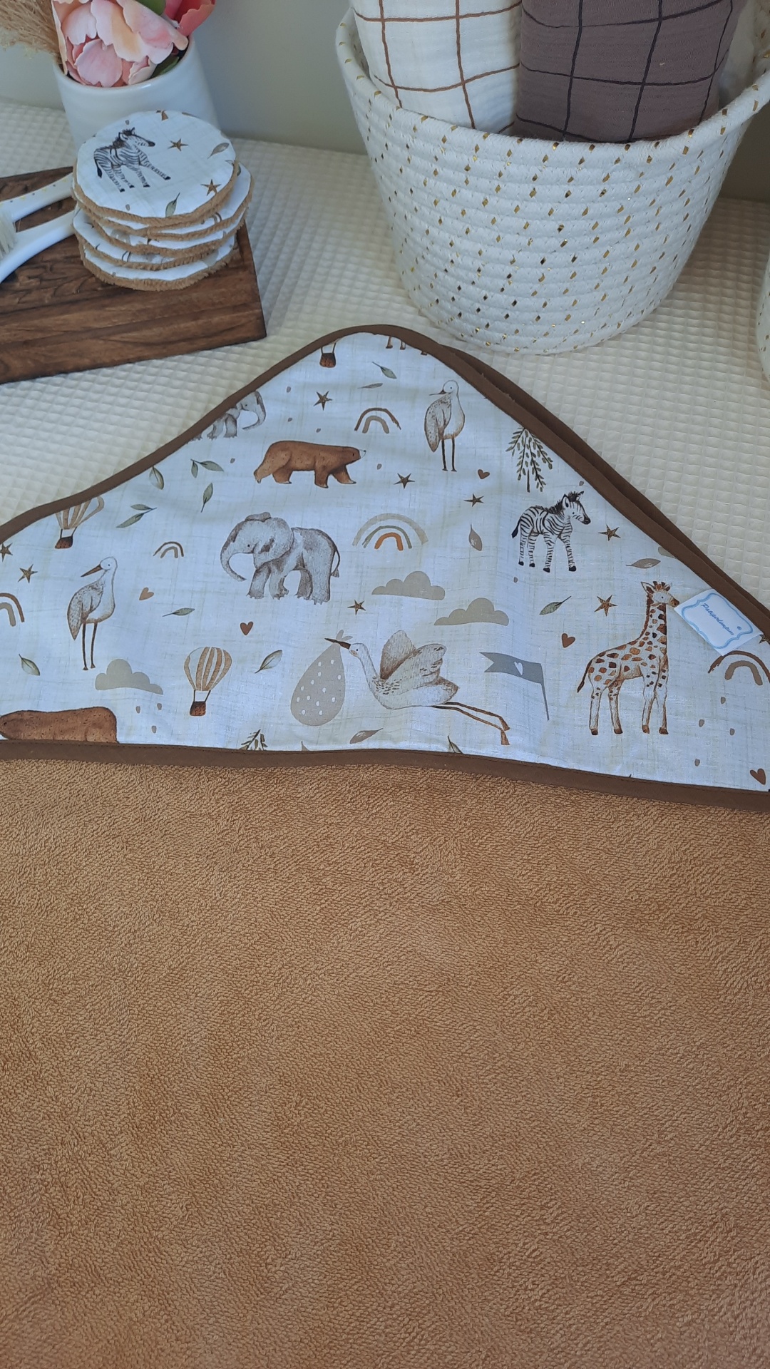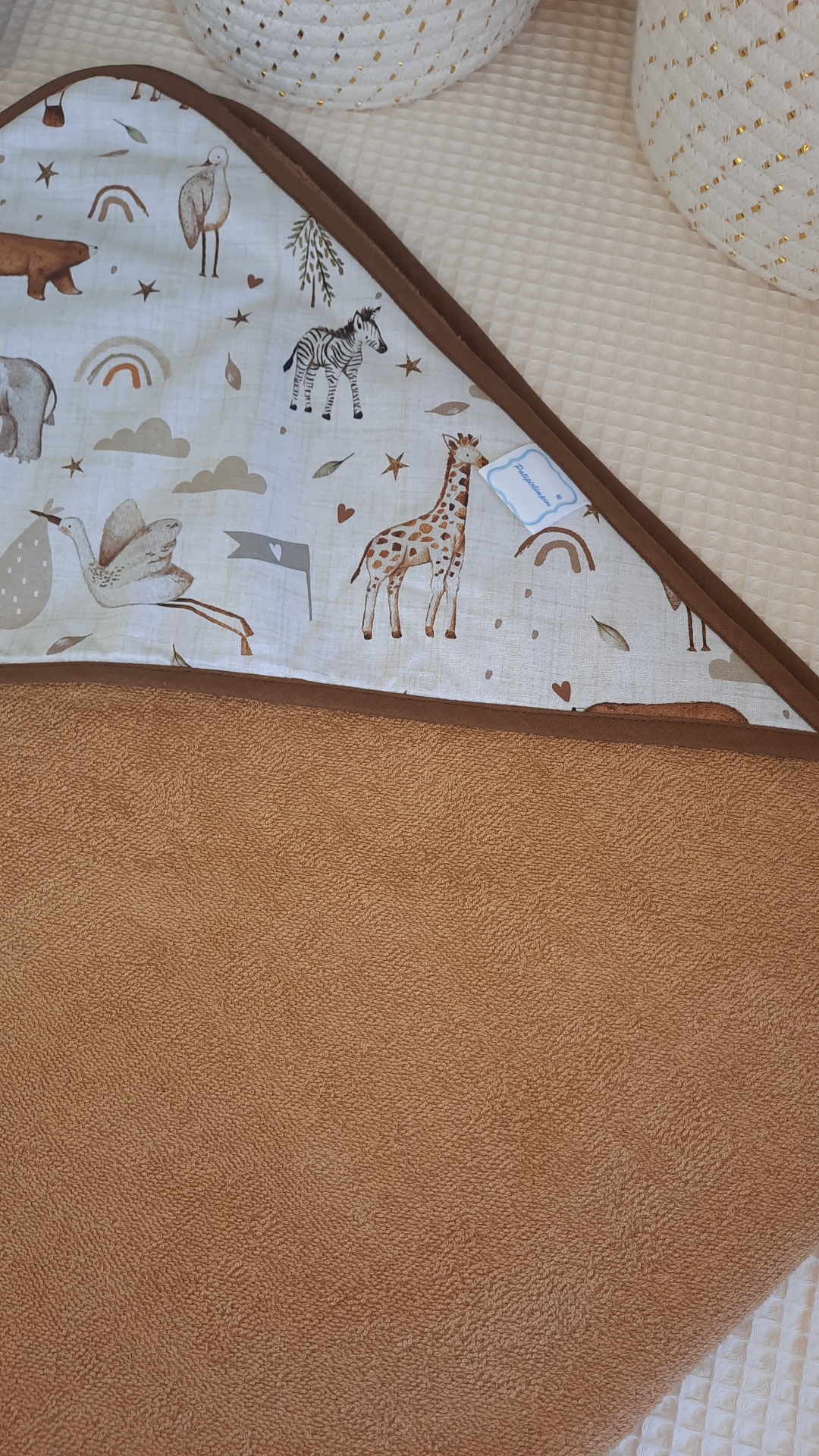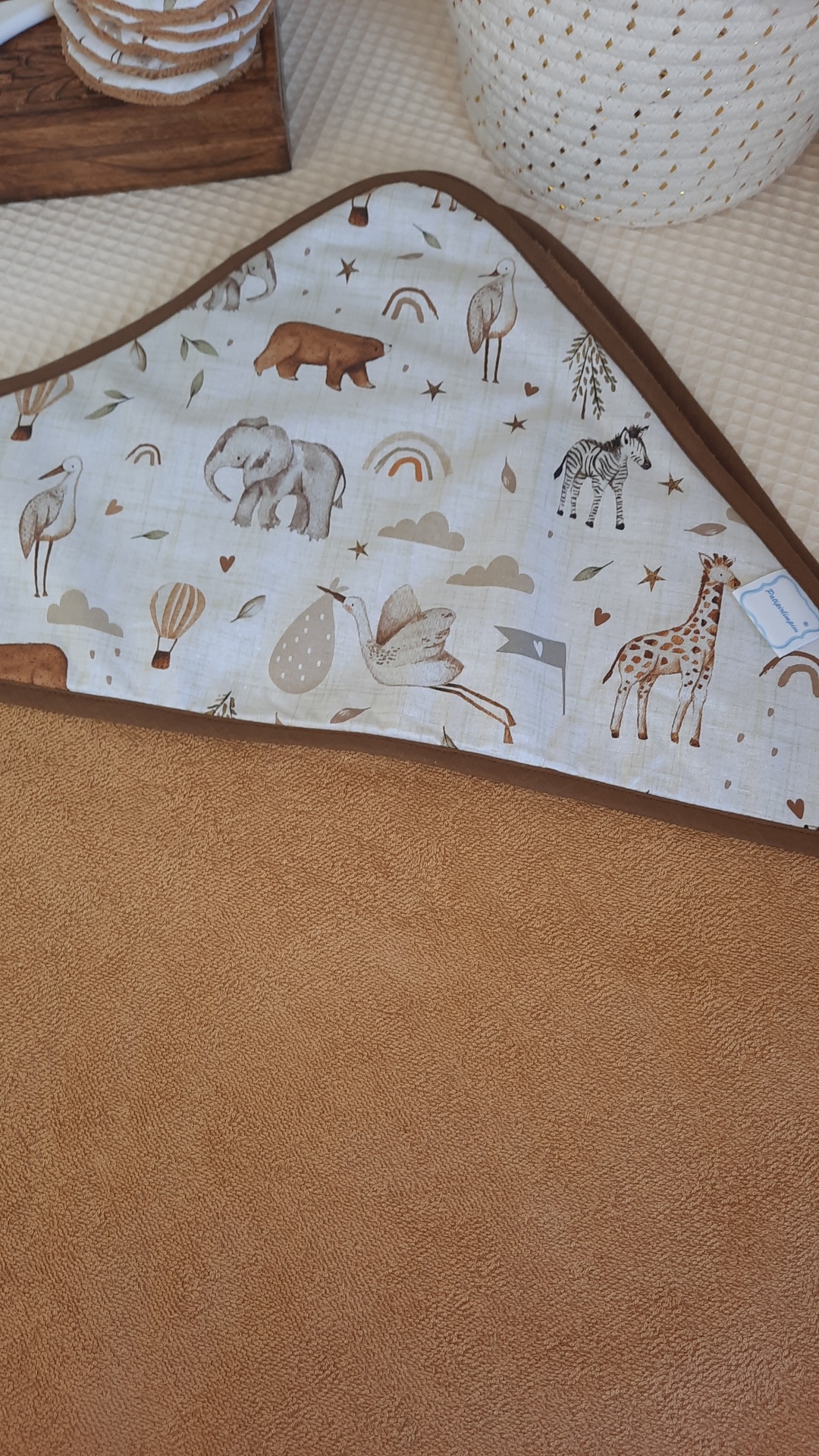 Mede 100x100cm. Irá acompanhar o crescimento do seu bebé, sendo uma toalha que pela sua qualidade e tamanho irá servir durante vários anos.